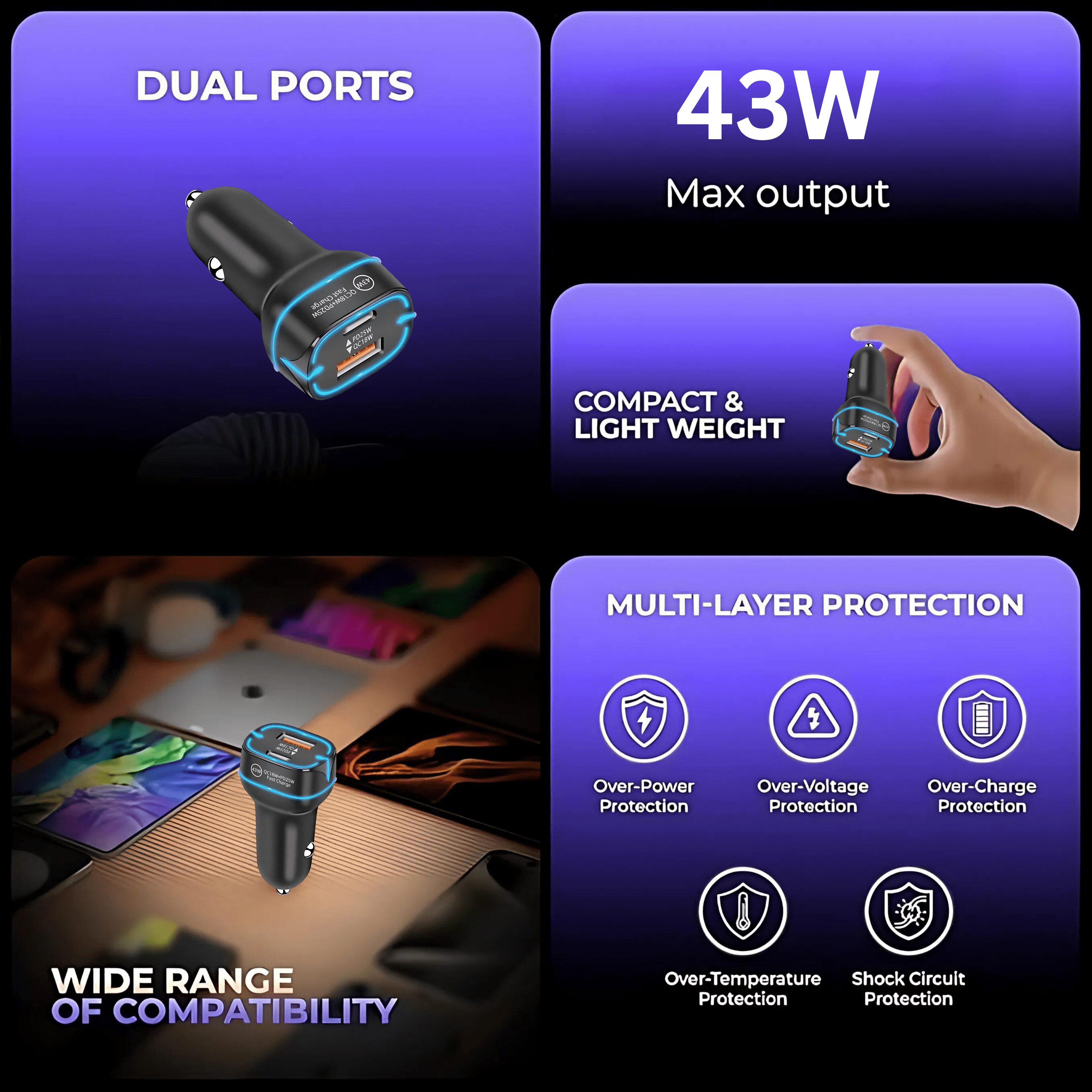 - 43W Fast Charging: It delivers 43W of power, ensuring your devices are charged quickly, perfect for long drives and busy commutes.